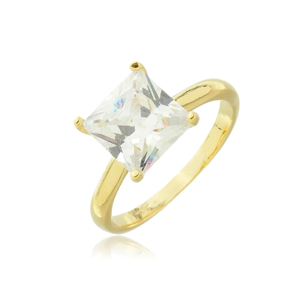 Anel Solitário com Zircônia Quadrada Grande Semijoia Ouro 18K