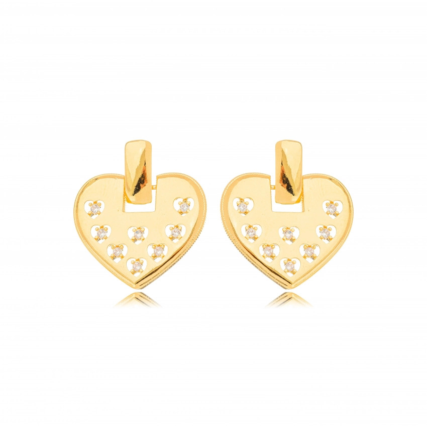 Semijoia Áurea Olympic - Brinco Coração Liso com Micro Zirconia Confeccionado em Banho de Ouro Amarelo de 18K.