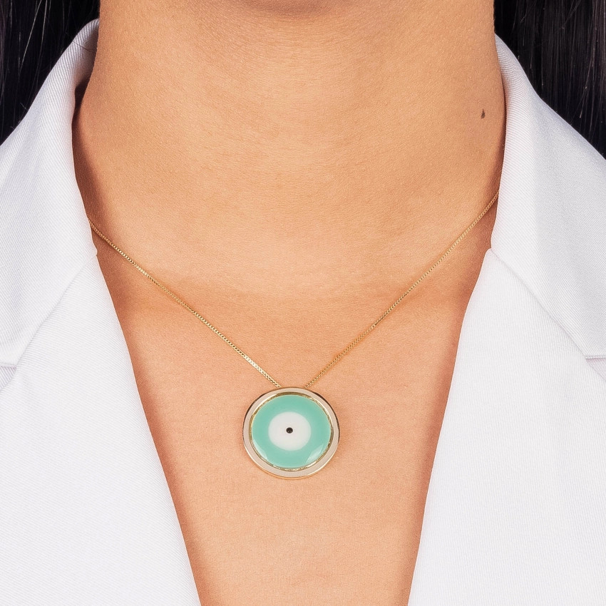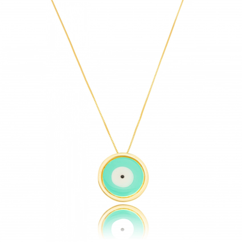 Semijoia Áurea Olympic - Colar Olho Grego Esmaltado Verde Água Confeccionado em Banho de Ouro Amarelo de 18K.